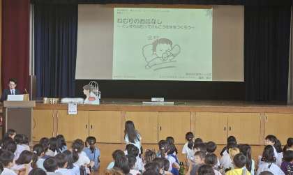 児童健康委員会が主催する学校保健委員会は、寝具メーカー西川さんのご協力による「ねむりのおはなし」でした。睡眠の重要性、理想的な寝る前の過ごし方など、ぐっすりねむってけんこうな体をつくるお話でした。