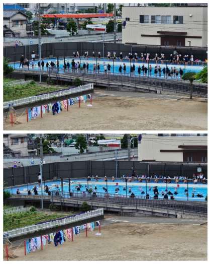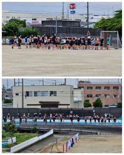 今日は、1・2年生が初めて水泳の授業を行いました。準備体操をした後、プールサイドで間隔をとってならび、先生からの指示確認、入水の仕方や水中歩行をするなど、ゆっくり水に慣れ親しむことから始めました。