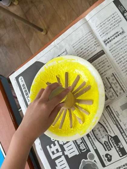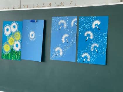 3年生は図工の時間に絵の具とトイレットパーの芯を使って、タンポポの花や綿毛を表現していました。ブルーの画用紙にタンポポが映えています。