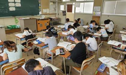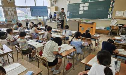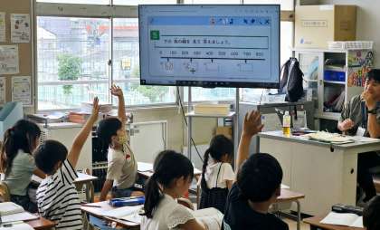2年生算数の授業は、数の線の読み方を考えようという学習のねらいのもと、1めもりの大きさに注目し、「100より大きい数をあらわした数の線の読み方」について、1めもりがいくつかを考え答えていきました。
