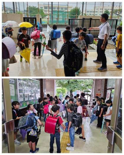 登校時は、傘をさして足元を気にしながら学校に向かってきます。梅雨入りが遅れていましたが、ようやく雨の季節になりました。早くに登校した児童は、玄関ロビーでしばらく待機して教室へと上がっていきました。