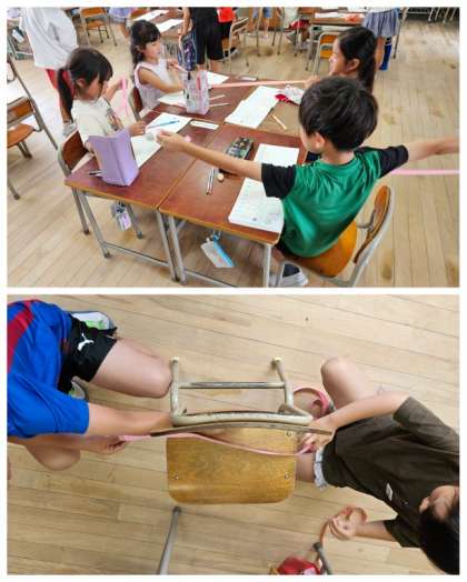 1年生算数の授業では、「てえぷにながさをうつしとって、ながさをくらべよう」という学習のねらいのもと、グループで紙テープを使って机やいすの高さや幅など、近くにあるものの長さをはかり比べていきました。