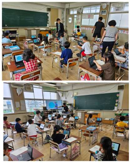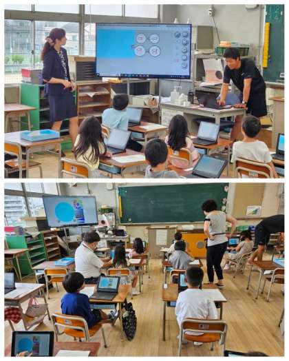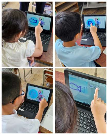 1年生は、タブレットを使ってICT支援員の先生他も入り、プログラミングの授業をしました。一人ひとりがペイントして描いた「さかなやいか、くらげ」などが、画面上でにぎやかに泳ぐ様子に感激していました。
