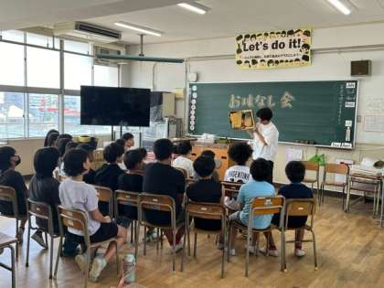 今日は、先日もお越しいただいた『すみよしおはなしパレット」の方に来校いただき、5年生の教室で、おはなしや絵本の読み聞かせをしてもらいました。