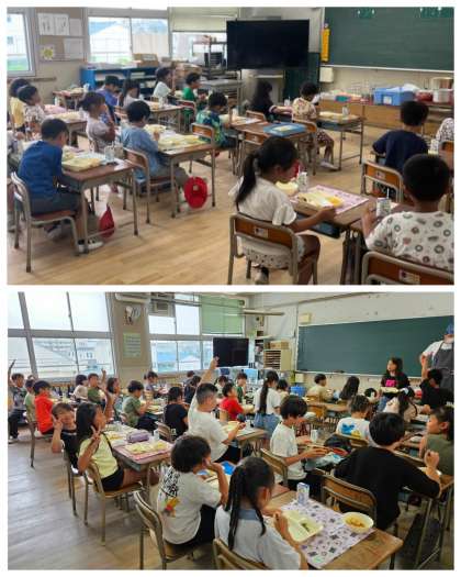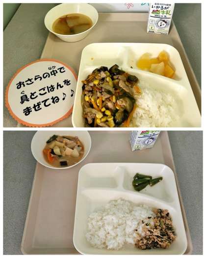 給食は、旬の食材や味つけの工夫がされてます。今日は梅ぼしを使った「オクラの梅風味」が出ています。昨日も学校給食献立コンクール優秀賞に選ばれた「夏野菜飯」が登場しました。給食は18日(木)までです。