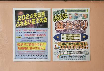 すでにご案内のとおり7月27日(土)午後5時より、地域主催『矢田西ふれあい盆踊り花火大会』が、公園南小公園で開催されます。午後5時より盆踊りと模擬店、午後8時より打ち上げ花火が予定されています。今年度は、近隣に駐輪場がありませんので徒歩でお越しください。また、児童のみなさんは、先日配付された「くじびき券」を持ってきてください。