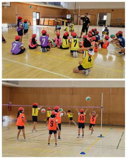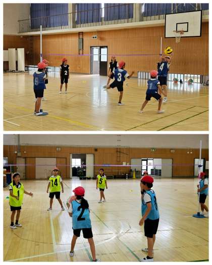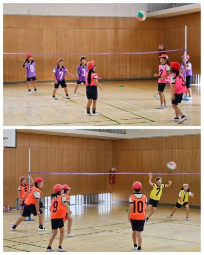 4年生体育の授業は、ネット型ゲーム「キャッチバレーボール」を行っています。操作しやすいボールを使い、グループごとに分かれてゲームを行い、協力しラリーをしたり得点を競い合ったりして楽しんでいました。