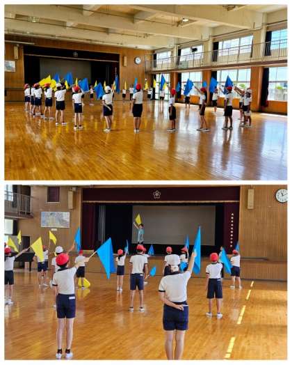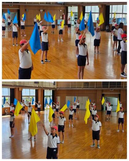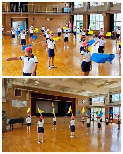 6年生の団体演技は、フラッグダンスです。今日は、一振りずつの振り方の角度や速度なども合わせる動きを確認しながら練習していきました。室内での練習では、フラッグのなびく音もよく聞こえそろっていました。