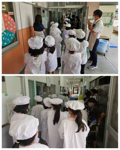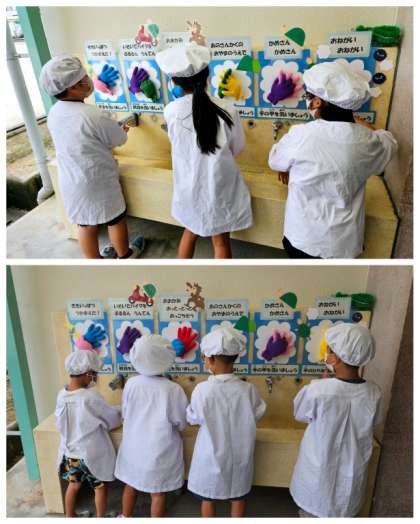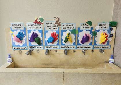 給食室入口にある手洗い場がリニューアルされています。手を近づけると自動で水が出てきたり、壁面には「正しい手の洗い方」が、カラー手袋を使い立体的に表現されています。いつも楽しく手洗いができています。