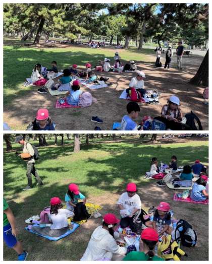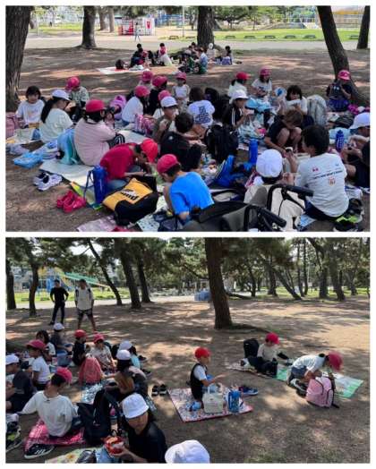 オリエンテーリングを終えて、昼食・おやつの時間となりました。木かげの場所に多くが集まって、お弁当・おやつをおいしくいただきました。