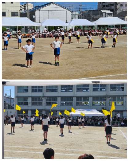 3年生は「ハロ 〜虹色の未来へ〜」、タオルを使って駆けまわる元気のよさを表現してくれました。最後は6年生の「Raise your flag」、風を切る音が聞こえるフラッグ使い、夢をのせて歩んできた勇姿がありました。