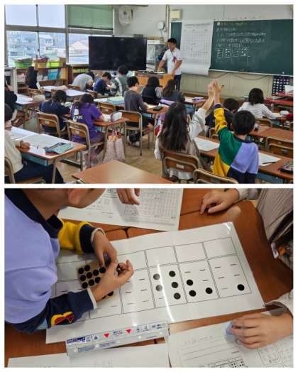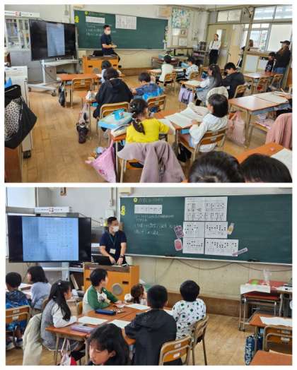 3年生は、目の不自由な方のバリアフリーについて考える学習がテーマでした。はじめに50音と濁点の点字について学習し、商品につける点字をグループで話し合い、台紙の上でシールを貼りつけて完成させました。