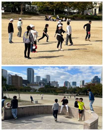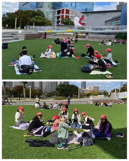 NHK大阪放送局の見学を終え、地下鉄で扇町へ移動しました。暖かい日ざしをうけ、扇町公園の人工芝広場でグループごとに分かれてお弁当をいただきました。食後はしばらくの間、公園内で自由時間を楽しみました。