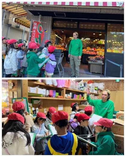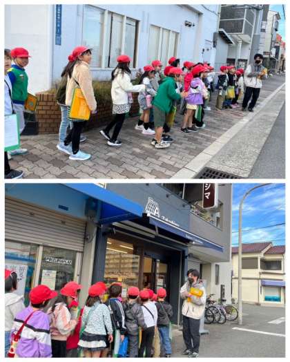 2年生2校時の生活科では、校区を4グループに分かれて町たんけんに出かけました。フルーツショップやパン屋さんでは、よく売れる商品やパンづくり方法など、あらかじめ準備した質問に答えてもらっていました。
