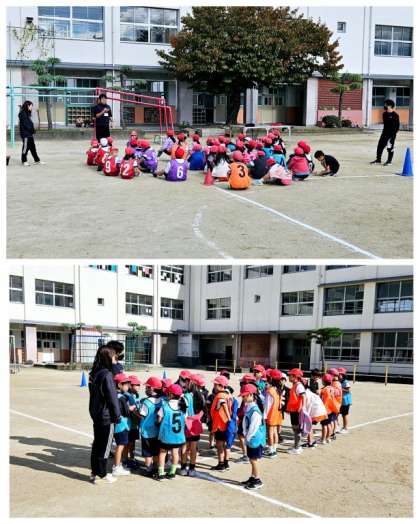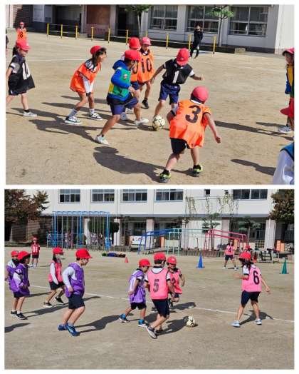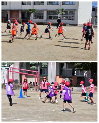 2年生体育の授業は、コーンでゴールを作った特設コート2面で、6チームが対戦や審判を交互にしながら、サッカー「矢田西ワールドカップ」リーグ戦を展開しています。今日も白熱した試合で盛りあがってました。