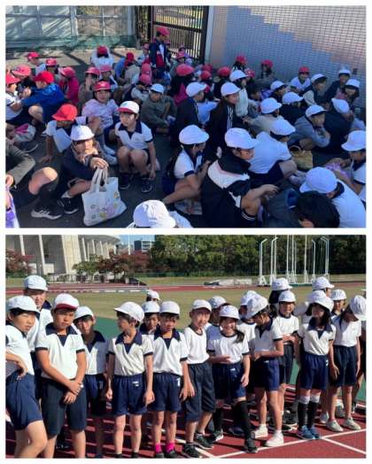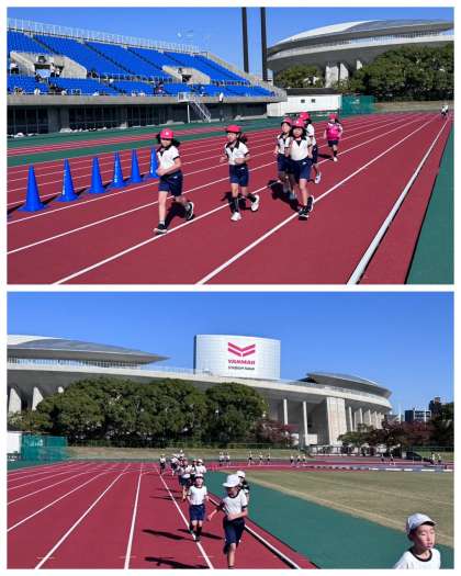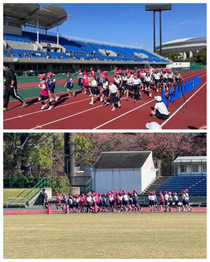続いて3・4年生。中学年はトラック3周で、ペース配分を整えての力走でした。児童たちは、フィールド内の先生やスタンドから保護者の方々の声援を受けて頑張りました。見事完走し仲間たちとたたえ合いました。