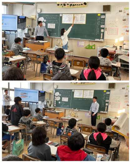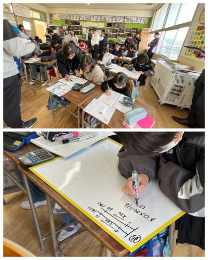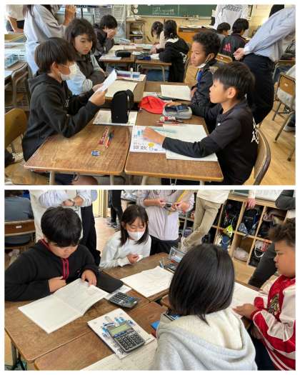 5年生は6校時に算数の研究授業を行いました。単元は「単位量あたりの大きさ」で、今日は〜時間もきょりもちがう時の速さの比べ方を考えよう〜というのが課題でした。グループ学習では活発に意見交換しました。