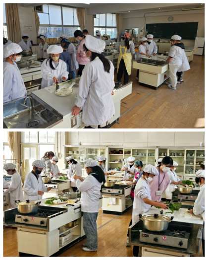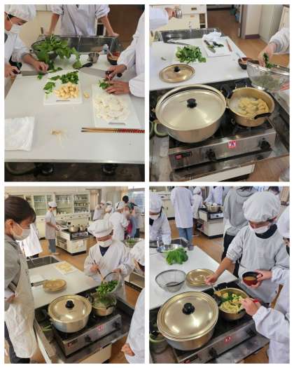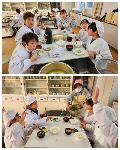 5年2組は、地域の方と田植えや稲刈りをし収穫した新米をいただきました。また、みそ汁の具材には地域で獲れたての田辺大根など。しろ菜のおひたしも添え、地産地消の「収穫祭」と名づけた調理実習をしました。