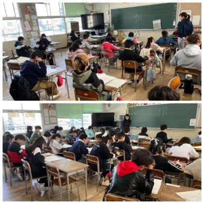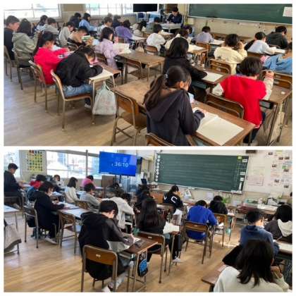 昨日から3〜6年生で実施している「学力経年調査」です。今日は2日目で、算数・理科・英語(5・6年生のみ)の教科を行います。どの学年も冊子になっている問題文に真剣に向き合っていました。