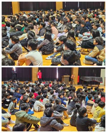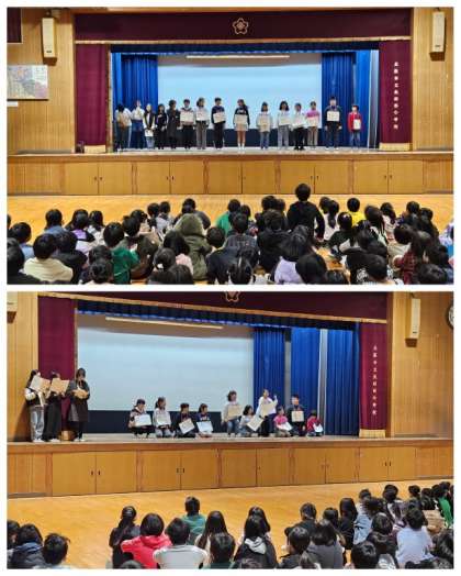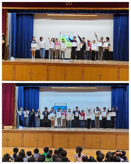 児童集会は、放課後に自主サークル活動をしている〜ぐうちょきぱあ〜のメンバーが、手話を交えて寸劇「11ぴきのねこ」を披露してくれました。観劇した児童は、上手に演じた舞台の児童に対し拍手がわきました。