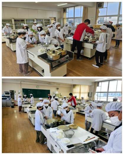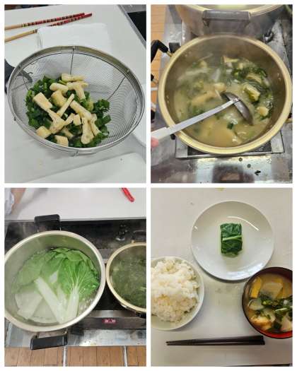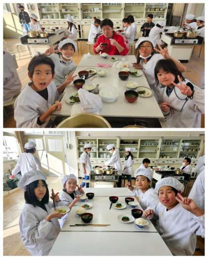 今日は5年1組。地域で田植えや稲刈り体験をして収穫した新米をいただきました。みそ汁の具材には近隣農家で収穫された田辺大根など。しろ菜をおひたしも添えて地産地消の「収穫祭」と名づけた調理実習でした。