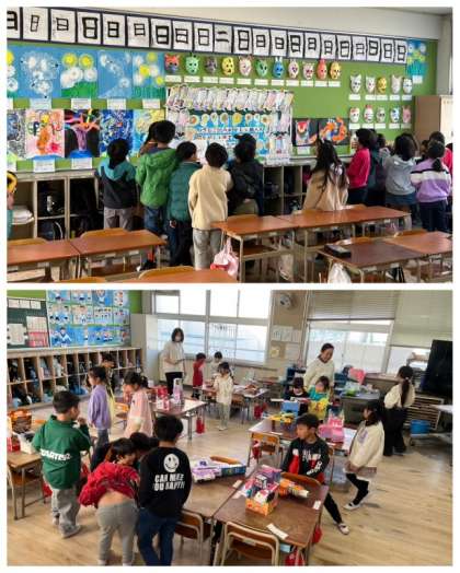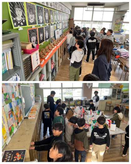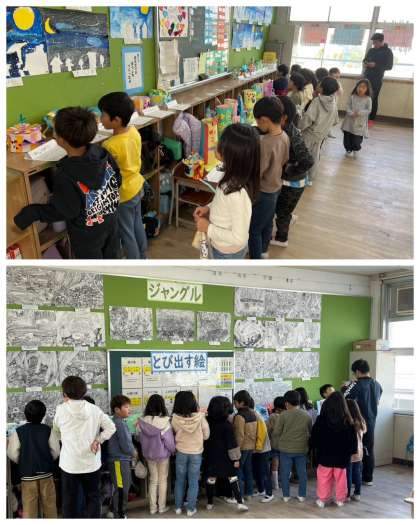 5校時に、全校児童が各教室を回って「作品鑑賞会」を行いました。他学年の表現力豊かな作品を鑑賞することで、互いの感性がみがかれたことと思います。保護者の皆様方は、懇談会で来校された時にご覧ください。