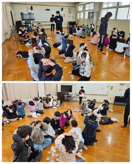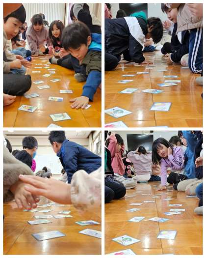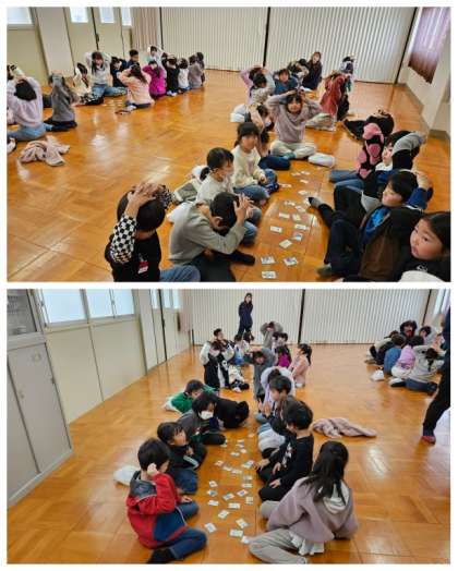2年生は、クラス対抗で「かるた大会」を行いました。4つの班で両手を頭の上にのせ、先生が「花よりだんご」「目の上のこぶ」「楽あれば苦あり」・・・など、読み終えるとすばやく絵札に手をのばしていました。