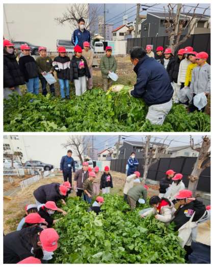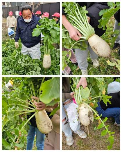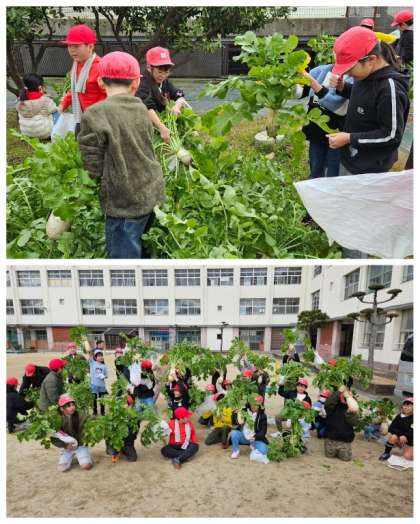5校時は、9月下旬に4年生が学習園で種植えした田辺大根を、地域の方から指導いただき収穫しました。中には丸みのある立派な白首大根が出てきて感激してました。手にした大根は、児童が各家庭に持ち帰ります。