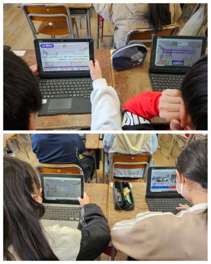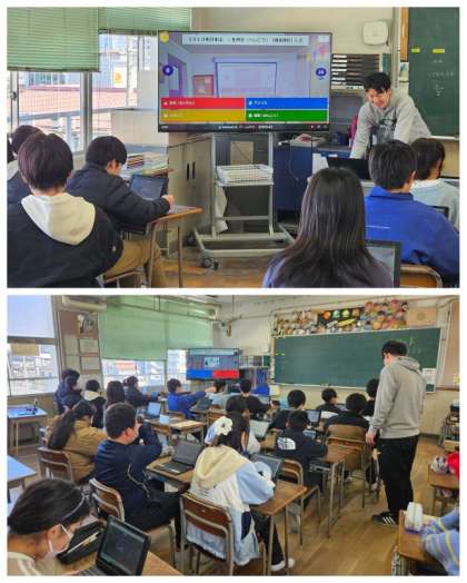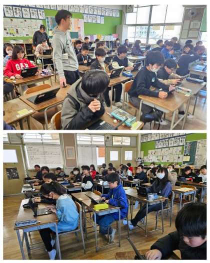 6年生社会科は、歴史で明治から大正のころのまとめの授業でした。単元の復習として、タブレットを使ってクイズ形式で学習理解度を互いに競い合っていました。その後、用意されたテストプリントもこなしました。