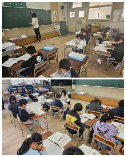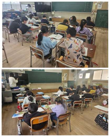 1年生国語の授業は「おはなしをかこう」でした。児童たちは、想像力をはたらかせ〜おはなしに出る人物が得意なことや好きなことを考えて、自分だけのおはなしをかこう〜というワークシートに取り組んでました。