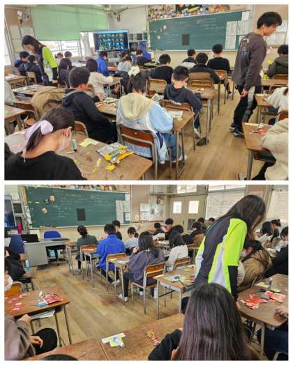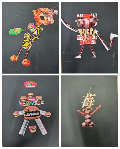 6年生図工の時間は、お菓子や食べ物の一つの商品箱をハサミで切り取り、人間の姿をした妖精を作ることがねらいでした。児童たちは、創造力をはたらかせ動きのある完成作品に仕上げ、黒台紙にのりづけしました。