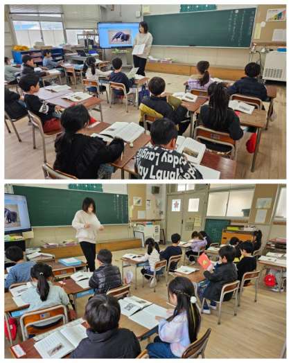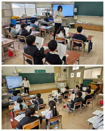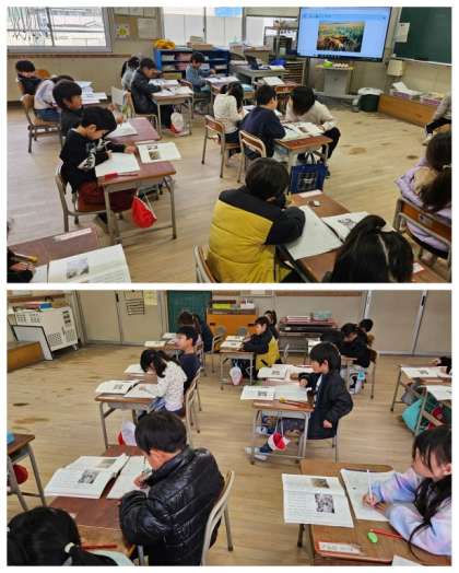 1年生国語の授業は「子どもをまもるどうぶつたち」の文章を読んで、それぞれのどうぶつのとくちょうをとらえ、ふしぎなことに気づいたり、どんなちえをはたらかせていたりするのかを、読み取り発表してました。