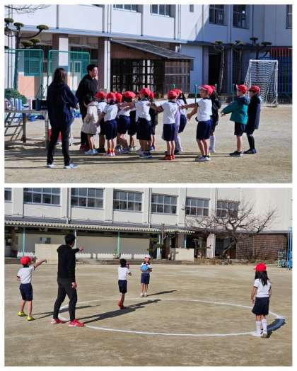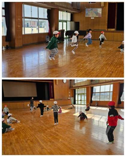 1年生体育の授業は、2組が中運動場でグループごとでボールゲームに親しみ、1組が講堂で短なわとびで回数を競いました。今日は、近隣の保育所から園児が小学校見学に来校し、児童たちはより張り切ってました。