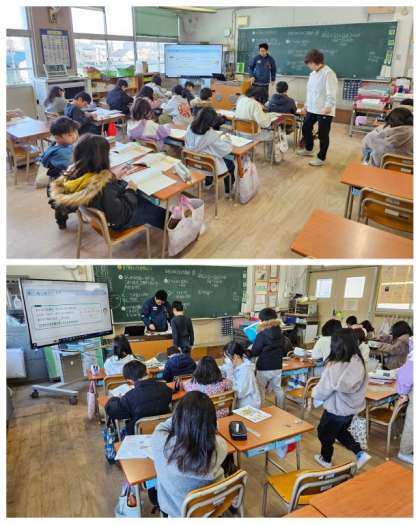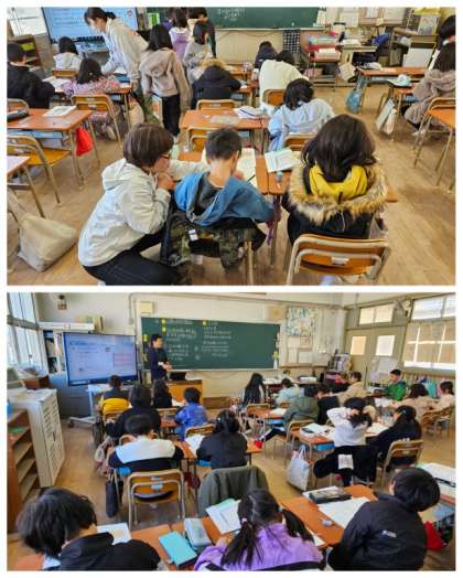 3年生算数の授業では、「5人がけの長いすが30こあります。全部で何人すわれますか」の問いに対して、各自が計算のしかたを考えその理由を説明しました。違った考え方があることにも理解を示していきました。