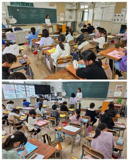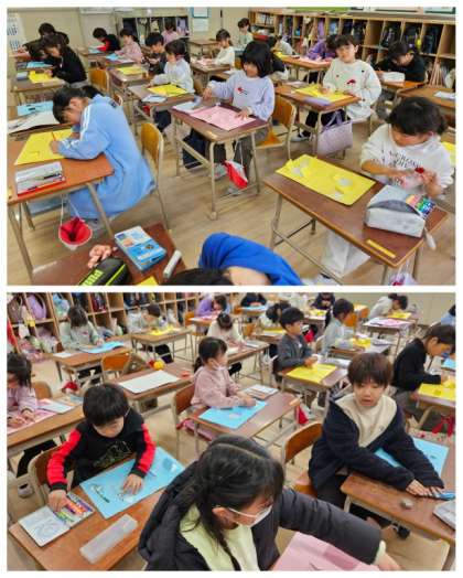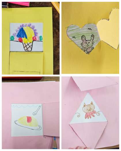 2年生図工の授業は「まどの中のせかいをかこう」というねらいで、画用紙と重ねた色画用紙に開けたまどから見える景色を、たくさん描いていきました。人物像や生き物、食べ物などユニークな世界が広がりました。