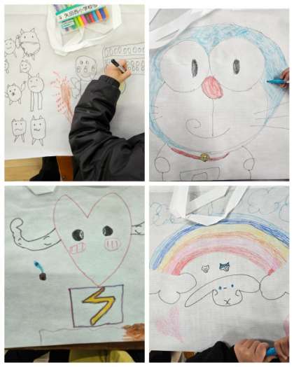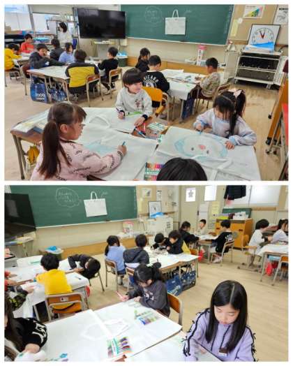 1年生生活科の授業では、今年度末の作品持ち帰り用で白無地のバックに、一人ひとりが色マジックを使って思い思いの絵を描いています。3月になり、いよいよ1年のまとめや進級に向けた取り組みが進んでいます。