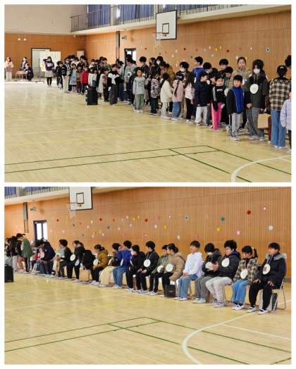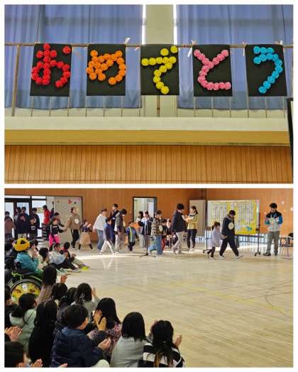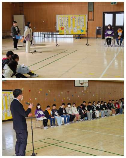 今日の2校時は、1年生から5年生の児童が卒業生に感謝の気持ちを込めて送別する「卒業を祝う会」でした。卒業生が1年生と微笑ましく手をつなぎ入場してきた後、児童代表・校長先生からあいさつがありました。