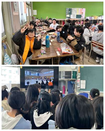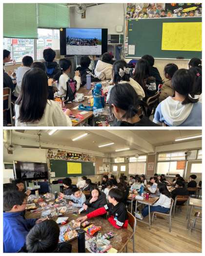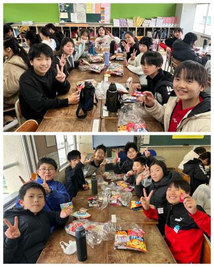 第2部は、午後から教室に戻って、お菓子を食べながらの茶話会が行われました。みんなで小学校6年間の「思い出ムービー」を鑑賞後、各グループでは笑いや歓声に包まれた楽しい『率先談笑茶話会』となりました。