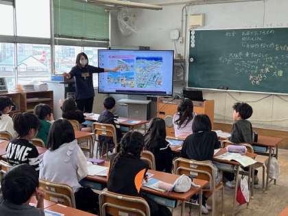 3年生から始まる社会科の学習。今日は「わたしたちのおおさか」にあるイラストを見ながら、どのような違いがあるかに気づき、発表していました。みんな、イラストをじっと見つめながら違いを探していました。