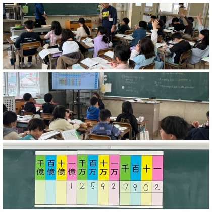 4年生の算数科の学習です。1億の10倍を10億ということ、10奥の10倍100億、100億の10倍が1000億であることを学びました。