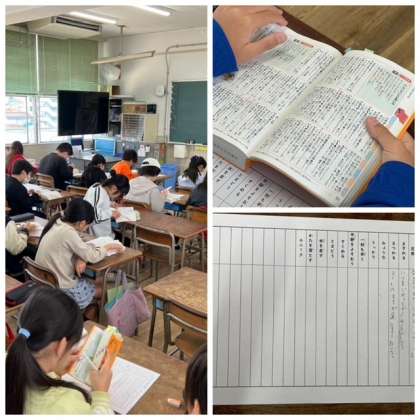 5年生の国語科の学習です。単元の導入部分である意味調べの時間でした。国語辞典を使い、ひとつひとつの言葉を調べました。たくさんある意味の中から文章にあう意味を選んでプリントに書き込んでいました。