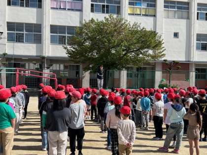 今朝の児童朝会の様子です。校長先生からは、先週の「創立記念日」や1・2年生で行われた「学校たんけん」のお話がありました。担当の先生からは、気温も上がってきたので水分補給や健康管理に気をつけるようにとのお話がありました。