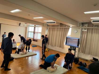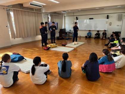 救命救急講習会の様子です。本日の放課後、消防署の方々に来ていただき講習会を実施しました。緊急の場合に備えるために、教職員が講習を受け、人形を使い、実際に救命活動を体験しました。