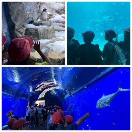 海遊館の館内の様子です。たくさんの海の生き物に興味津々です。海のトンネルはまるで魚が空を飛んでいるように見えます。