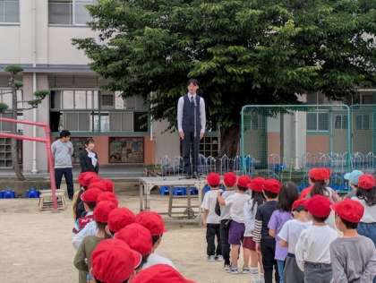 今朝は、児童朝会がありました。毎週月曜日に子どもたちの学習支援をしていただくことになった大学生お2人の紹介がありました。その後、6年生の代表が全児童の前でソフトボール投げのお手本を披露し、大きな歓声があがりました。