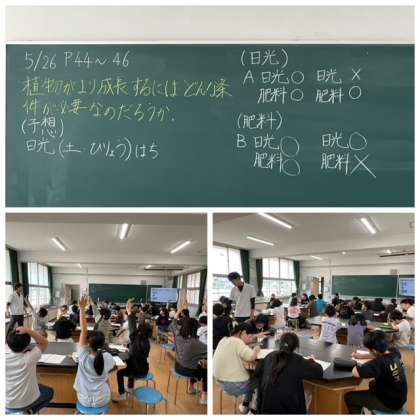5年生の理科の学習です。発芽に必要な条件を学習した後、植物の成長に必要な条件は何かを考えました。発芽した種子を使って、同じにしておく条件・変える条件を考えながら実験の準備をしました。