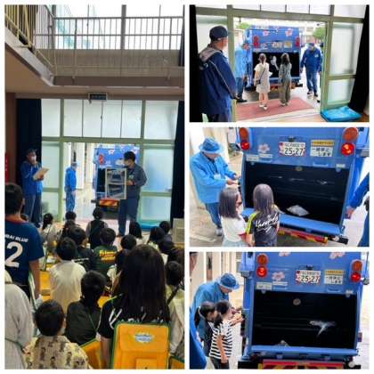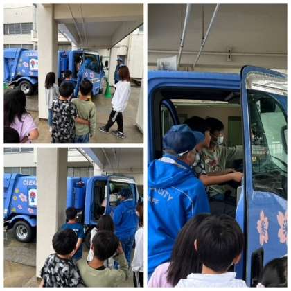 4年生は、中部環境事業センターの方に来校いただき、パッカー車のしくみを学びました。児童たちは、用意したごみを投入したり、ごみの減量に加え普通ごみや資源ごみなどの分別収集についても理解を深めました。