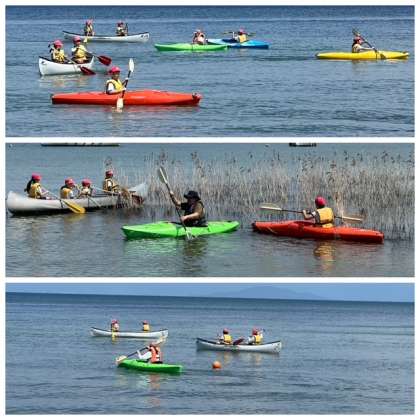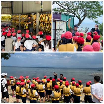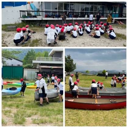 カヌー体験のスタートです。注意事項をしっかり受けて、安全に楽しく活動しています。