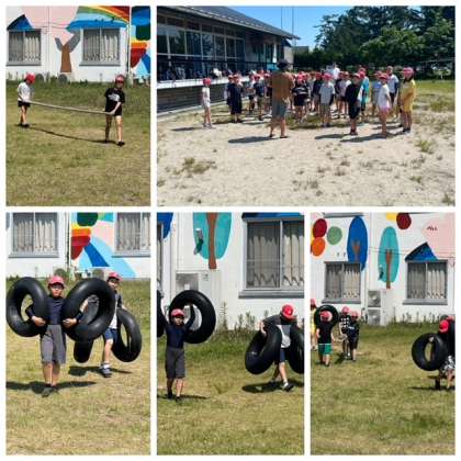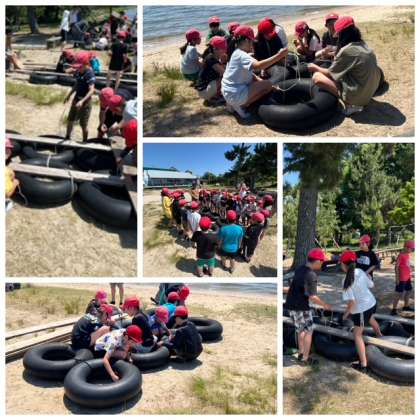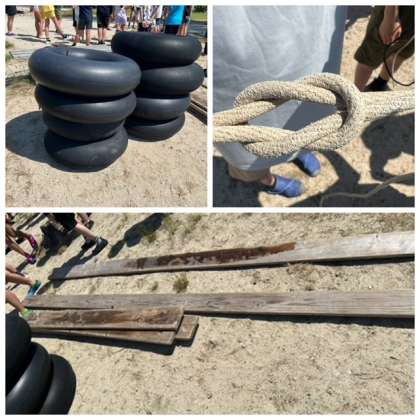 いかだ作りがはじまっています。友達と協力してタイヤと板を繋げています。まもなく出航です。