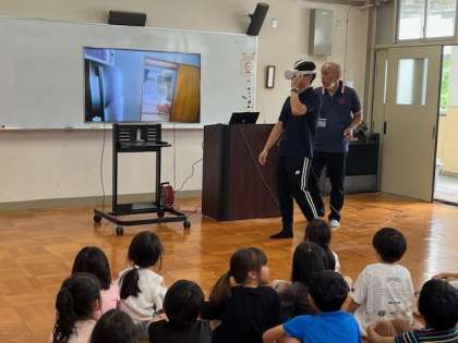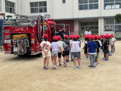 1・2年生は、教室で動画視聴や多目的室で先生によるVR地震体験を映像で見ました。また、中運動場で消防車についての説明を受けました。